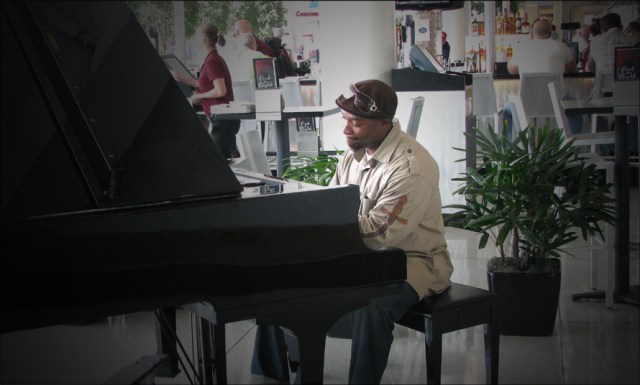 I was traveling through Charlotte today with a minor reminder that it was lunchtime, but was quickly informed by my senses that I was hungry for something else. I was derailed from my hectic pace toward the boarding gate by the lively, yet relaxing sounds of Levar at his glossy black, Yamaha piano. He had a smile and energy about him that let everyone know he was playing for him, but the passer-bys were more than welcome to join his world.