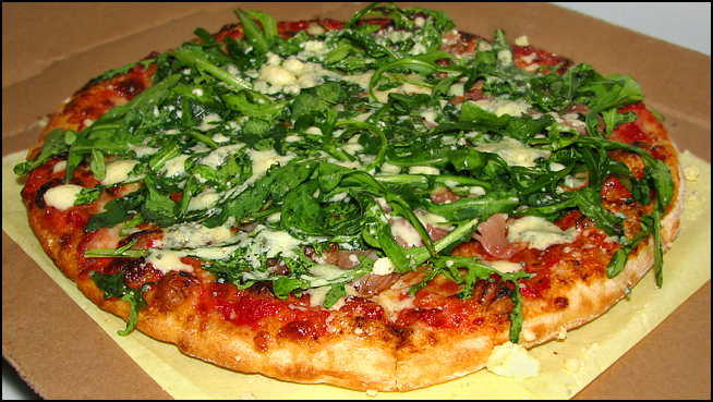 Our pizza was boxed hot and fresh. The ingredients provided a great combination of salty (ham), savory/sweet (sauce) and peppery (arugula). The creamy mouthfeel of the gorgonzola and fluffiness of the crust brought it all together.