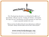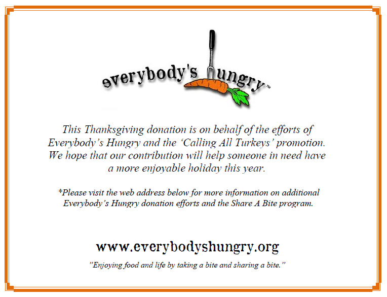For those of you who have chosen to provide food, time or money to an organization in your community on behalf of the Calling All Turkeys promo, please do not forget to send us information on your contribution. We will be acknowledging donors in an upcoming roll-call article and would like to make sure everyone is featured. Email us through the Contact page or at jason@everybodyshungry.org with the below details and so that you can be recognized for your efforts and generosity.
