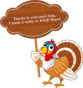 Thanks to everyone’s support and involvement, we reached our goals! Three frozen birds of Thanksgiving representation were delivered on Tuesday to the appreciative hands of Rich working the loading dock of FOOD Share. Weighing in at a total of 66 lbs., the turkeys will end up on the tables and serving counters of those in need of a better meal this Thanksgiving. Every act of generosity makes a difference and this holiday, and through your faithful involvement of the blog, we were able to provide an improvement to someone’s holiday.