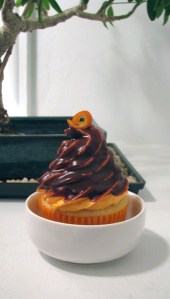The Cupcake Counter treat showcased this week is called the Orange You Glad It’s Cupcake Day?!? This Orangette inspired cupcake immediately reminds you of a chocolate dipped ice cream cone. The luscious, orange-infused frosting underneath is just as creamy and the chocolate granache dip has a certain break to it. A subtle citrusy cake hides a surprise inside with large chunks of decadent chocolate. For a little pinch of fun, it gets topped with candied orange peel. If you like Orangettes, or even Terry’s Chocolate Orange, you would quickly vote this cupcake a winner.