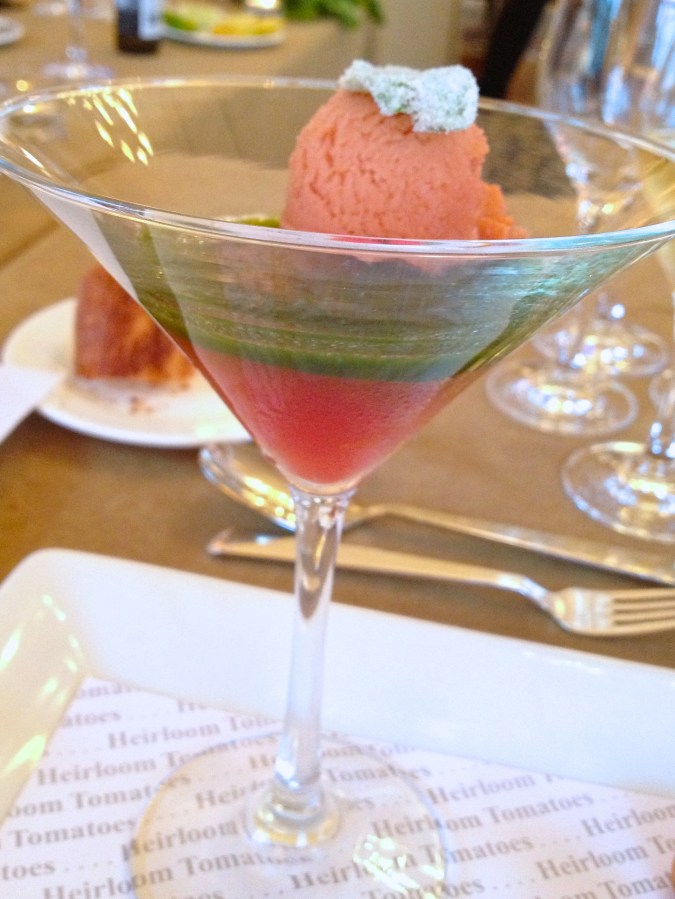 Heirloom Tomato Terrine w/ Basil Gelee, Tomato Sorbet and Goat Cheese Gougeres – Ritz Carlton Half Moon Bay