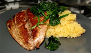 Editors Note: Mashed rutabaga is pictured above, served with pan seared yellowtail seasoned with pink Himalayan sea salt and powdered ginger, topped with wilted spinach.