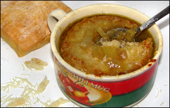 This week’s recipe ended up being a personal treat for me. The air has been quite chilly lately, so to combat the elements and satisfy the requirement of a recipe submission, my wife set her sights on soup. She’s never made soup before, but with purpose in her eyes she began flipping pages of her new Barefoot Contessa cookbook. To my delight, she stopped on Onion and Fennel Soup Gratin.
