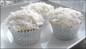 These snowballs can also become “snowcaps.” Rather than covering the top and sides of the cupcake with frosting and coconut, frost just the top of the cupcake with a generous amount of frosting, then dip the tip in coconut.