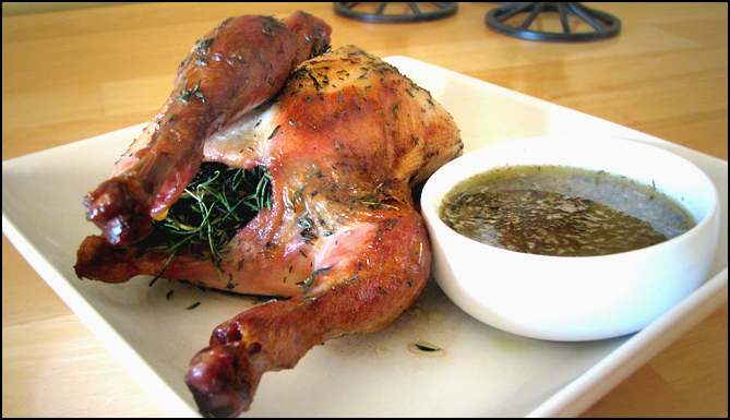 Our latest submission is a recipe that we’ve been holding in our pocket, but are excited to release. Roast chicken may not seem like a summertime option, but with all the barbecues and gatherings, it may be just perfect. You can roast ahead of time and convert the chicken to a refreshing batch of chicken salad with celery and grapes, summer salad with fresh greens and sweet red strawberries, or simply display it on the picnic table and let attendees tear into. However you serve it, it’s hard to deny the simplicity and comfort of a good, juicy, flavorful roast chicken. We deviated from the recipe just a pinch and stuffed our bird with fresh herbs and drizzled a bit of olive oil in addition to the butter. We also used a no soy/no corn chicken, coming in a little undersized than typical grocery store chickens, but packed with just as much flavor.